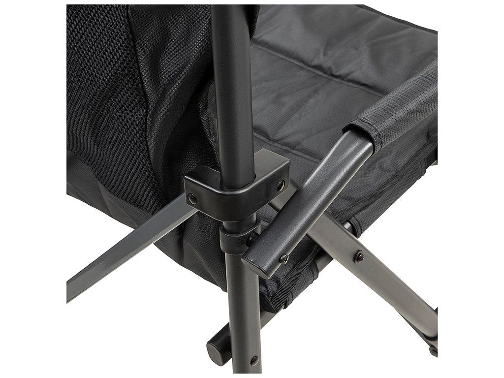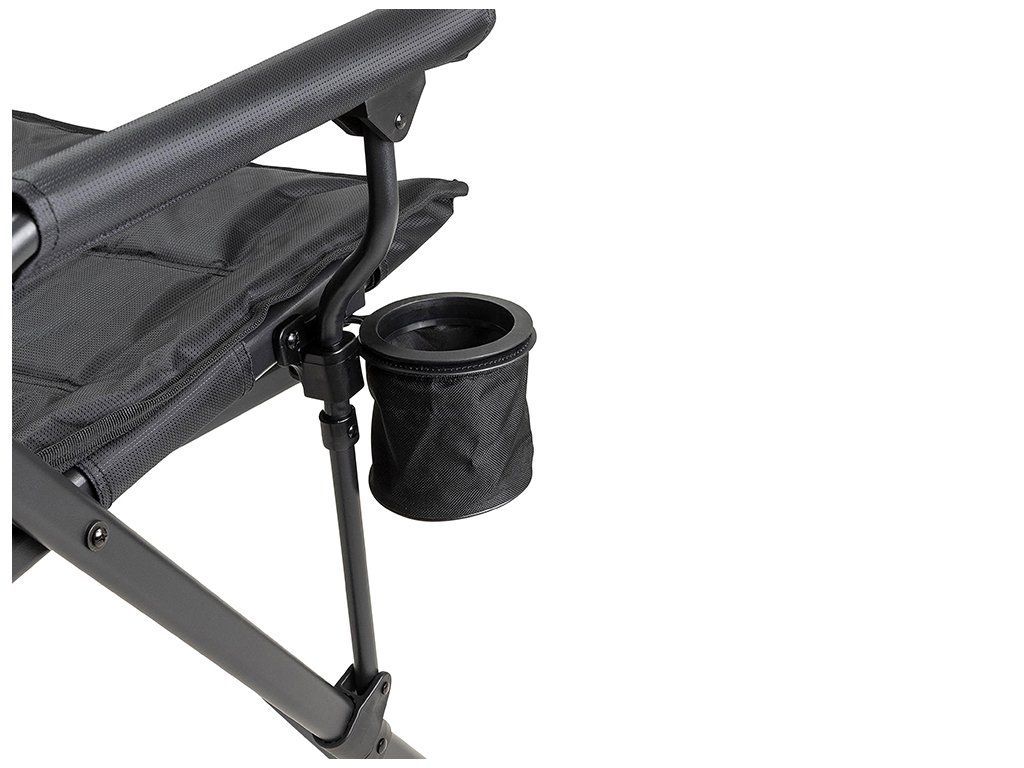 O komfort se postarají také polstrované područky. A protože v kempu se počítá každý detail, nechybí praktické úložné prvky – otočný držák na nápoj a zadní síťovaná kapsa na drobnosti.