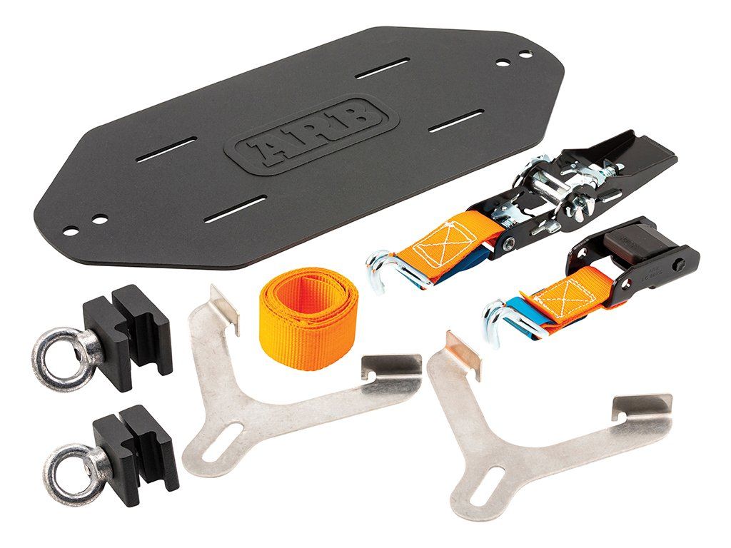 Součástí je základna, ráčnový popruh a 2× upevňovací oka (eye bolts). Držák lze přichytit buď na jeden příčník, nebo jej umístit tak, aby přemostil mezi příčníky – podle rozložení vybavení na střeše a konfigurace nosiče.
