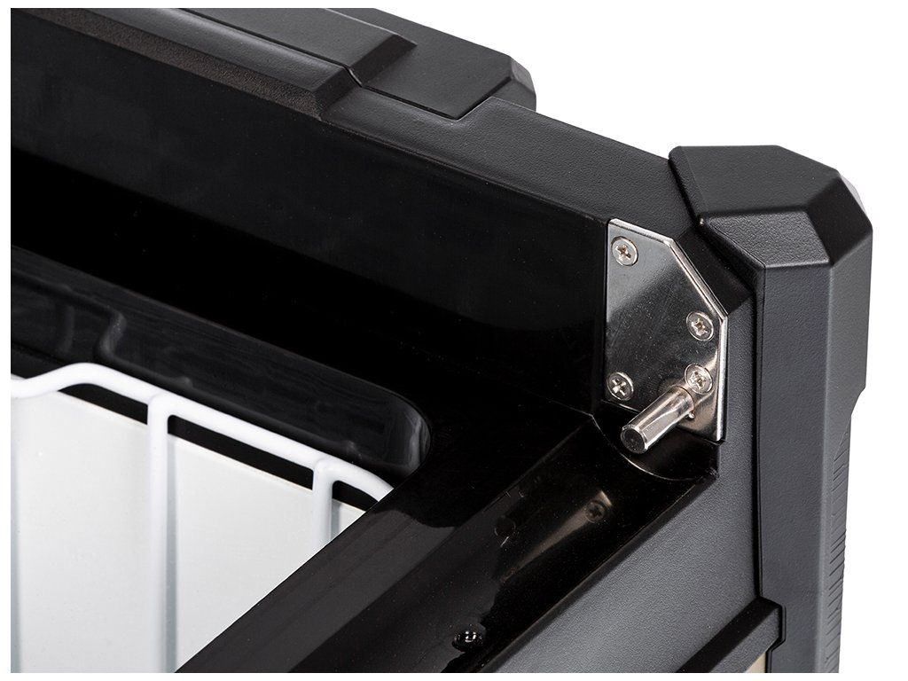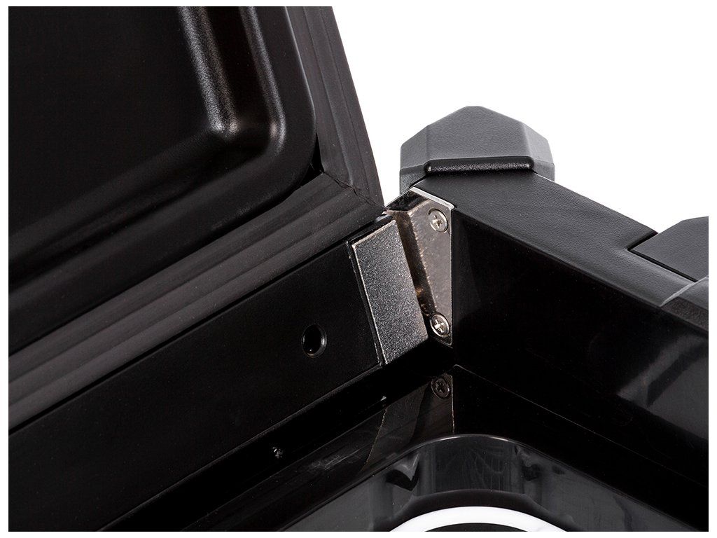 Lednice má robustní ocelový vnější plášť a rohové lišty po celé výšce pro lepší ochranu při přepravě a používání. Zapuštěná madla mají integrované body pro kotvení. Víko je rychle odnímatelné a má protiskluzovou úpravu, takže poslouží i jako odkládací plocha. Nechybí dobře čitelný LED displej a vnitřní LED osvětlení s nízkou spotřebou.