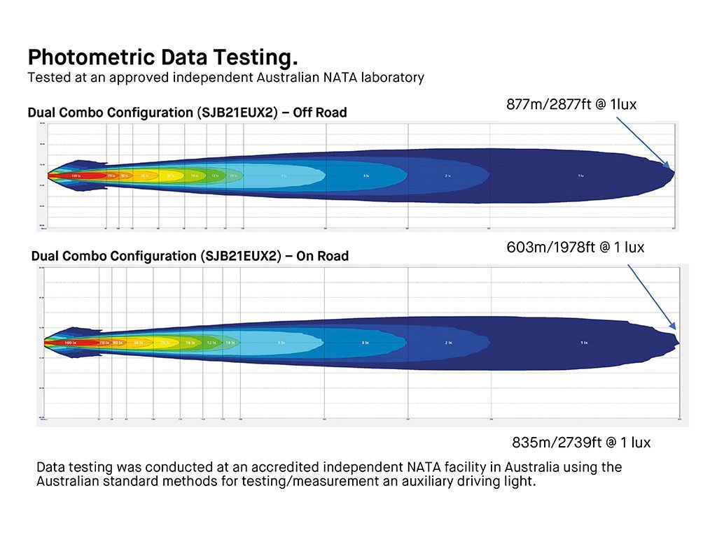 - 2 světla (kombinace) až 877 m / 1 lux při úrovni #5 (terénní režim)