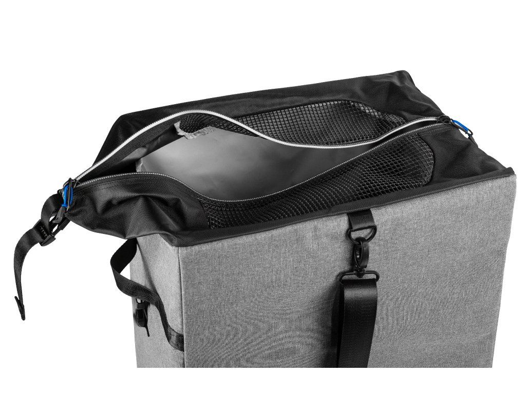Vak je uzavíratelný odolným zipem, takže prádlo zůstane bezpečně uvnitř i při jízdě. O odvětrání se stará panel z gumové síťoviny, který pomáhá cirkulaci vzduchu.
