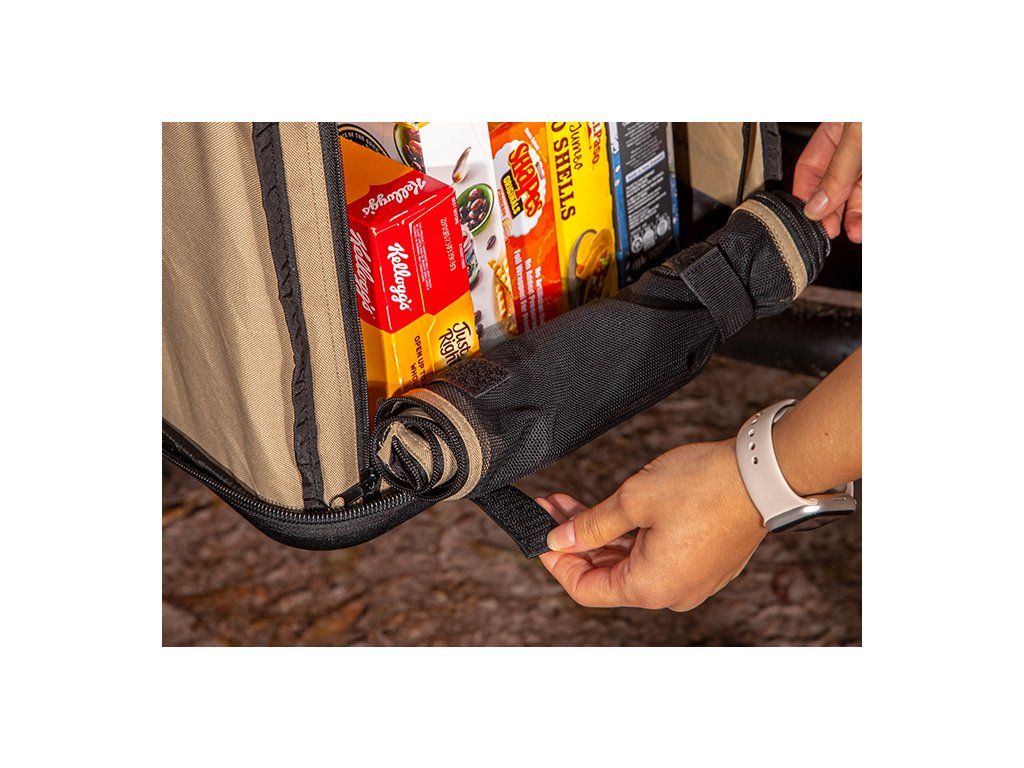 Přední strana je opatřena síťovaným oknem se zipem, které pomáhá chránit obsah před hmyzem a zároveň udrží věci uvnitř, i když organizér složíte nebo převážíte už naplněný.