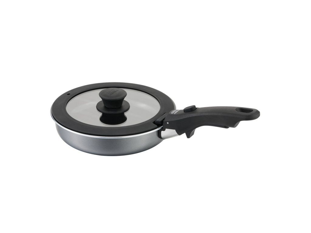 Velkou výhodou je odnímatelná univerzální rukojeť – pevně se nacvakne na každý kus nádobí, šetří místo při přepravě a zvyšuje bezpečnost při manipulaci. Všechny díly jsou navržené tak, aby do sebe kompaktně zapadly a vešly se do přiložené transportní tašky.