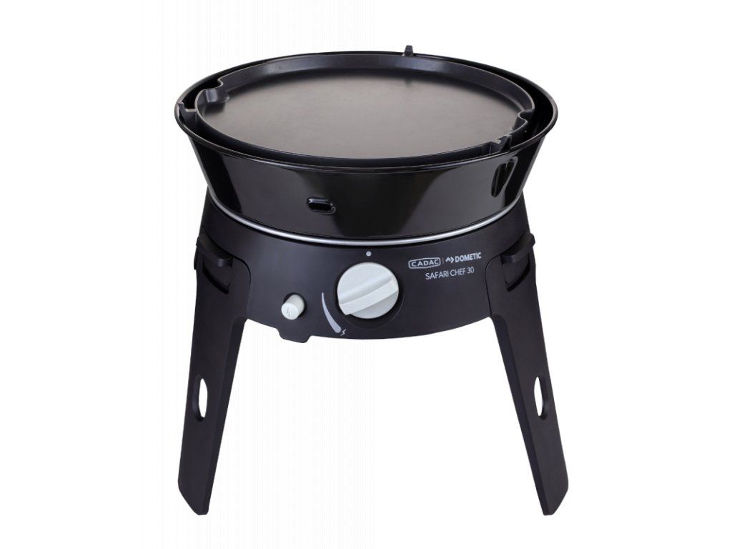 Safari Chef 30 HP Deluxe je lehký a skladný plynový gril, který se skvěle hodí na cesty, dovolenou, kempování i piknik. Váží jen cca 4,5 kg a nabízí hned čtyři způsoby vaření – od klasického grilování až po smažení na plotně nebo vaření v pánvi.