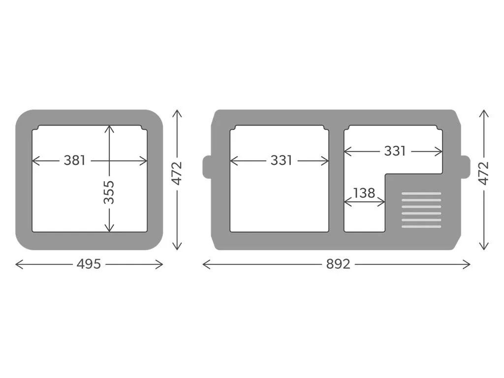 495 mm (19,49") D × 892 mm (35,12") Š × 472 mm (18,58") V