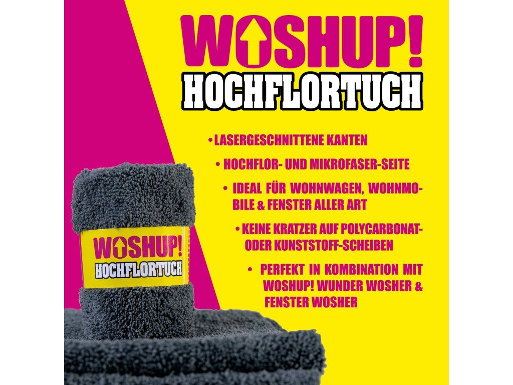 WOSHUP! je německá značka zaměřená na účinné a přitom šetrné čisticí a pečující prostředky pro karavany, obytné vozy i kempingové vybavení. V sortimentu najdete přípravky pro běžnou údržbu i důkladné čištění – od toalety a sanitární části, přes kuchyň a interiér, až po okna, lak, plasty a další povrchy na vozidle.
