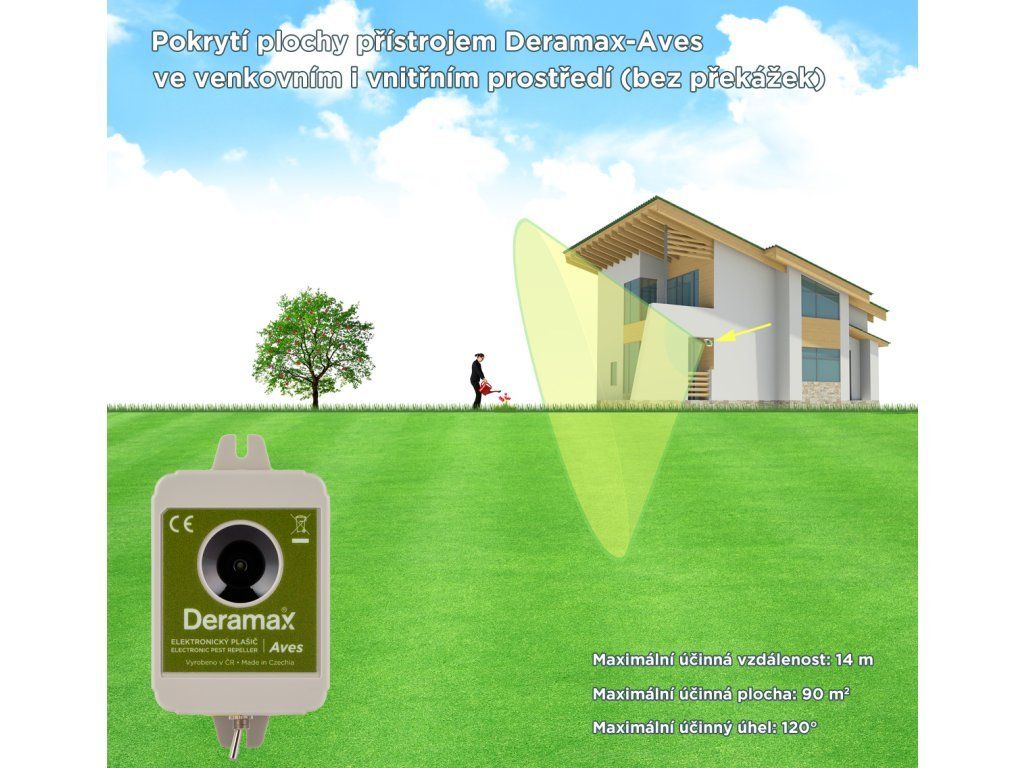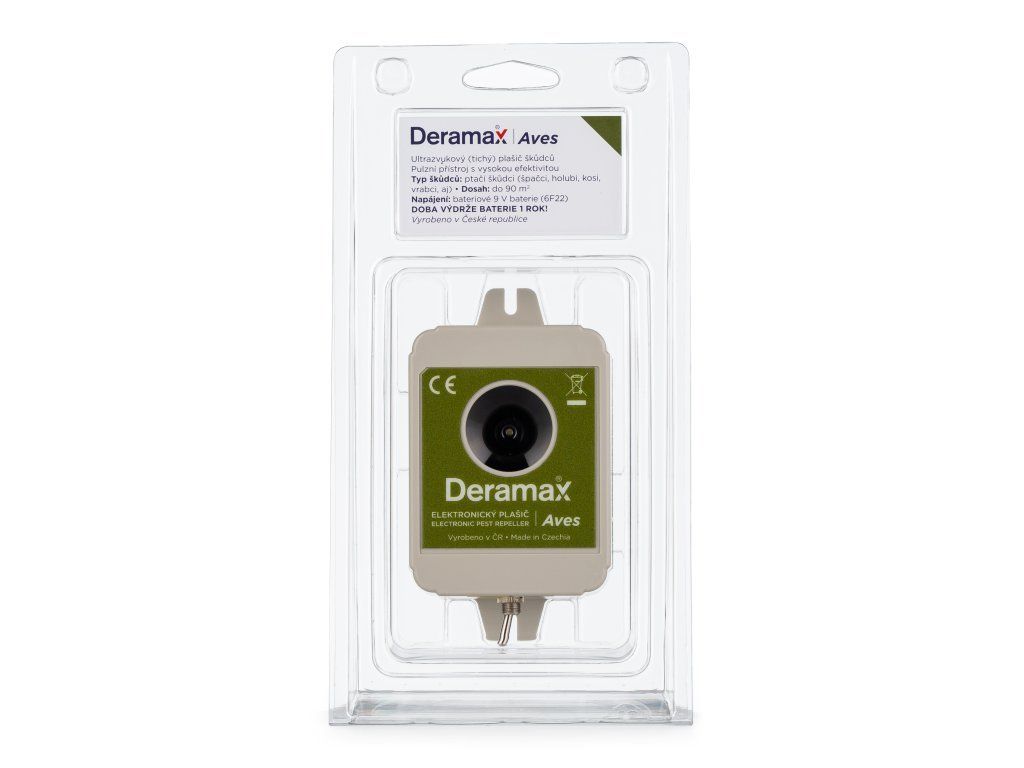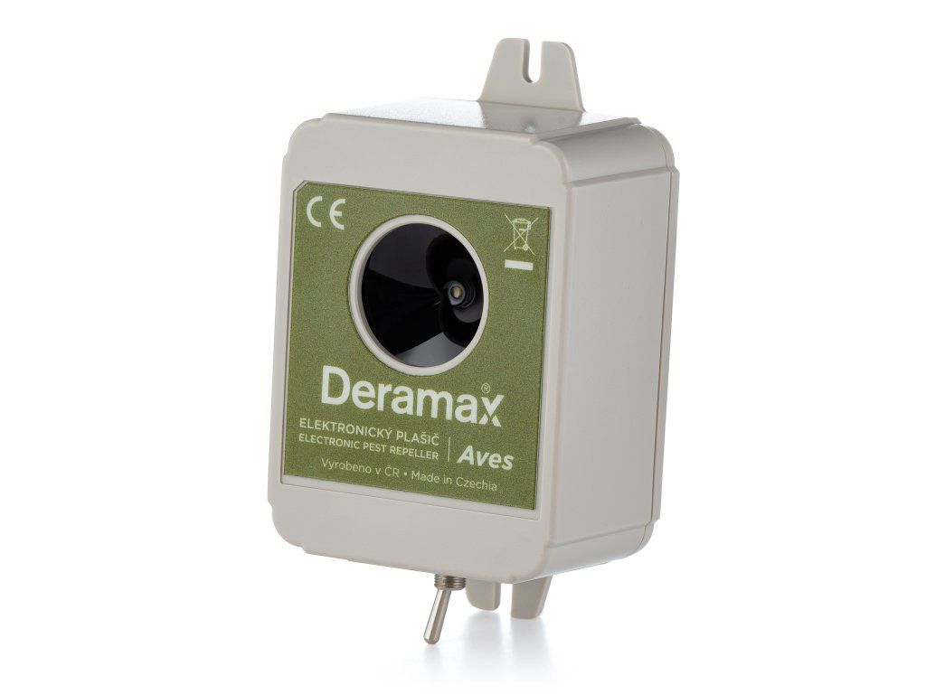 Deramax® Aves je pulzní subultrazvukový plašič ptáků určený pro ekologickou ochranu prostor bez použití chemických prostředků. Generuje specifické vysokofrekvenční signály, které jsou pro ptáky velmi nepříjemné, takže po krátkém čase chráněný prostor opouštějí a hledají si nové útočiště mimo dosah zařízení.