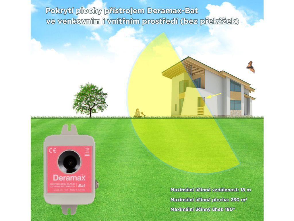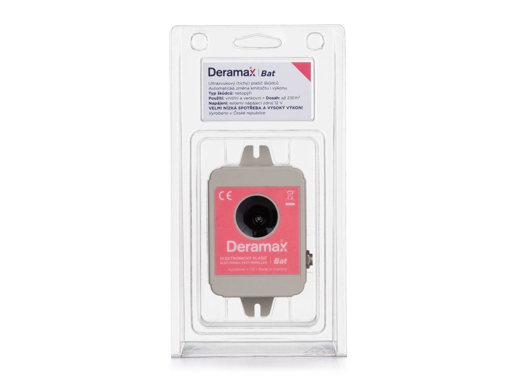 Deramax® Bat je ultrazvukový plašič určený k ochraně vnitřních i venkovních prostor před netopýry. Pro člověka je zcela bezpečný a bezhlučný. Netopýři jsou trvale obtěžováni ultrazvukovými signály a v krátkém čase chráněný prostor opouštějí. Provoz zařízení je ekologický, bez použití chemických prostředků.
