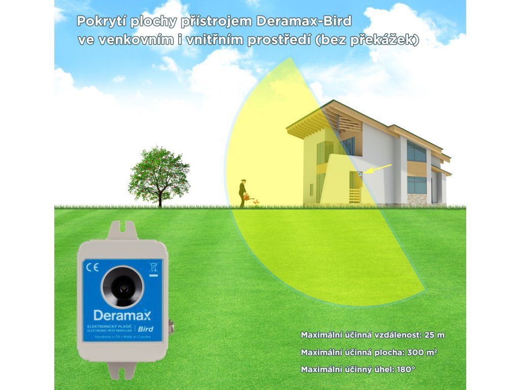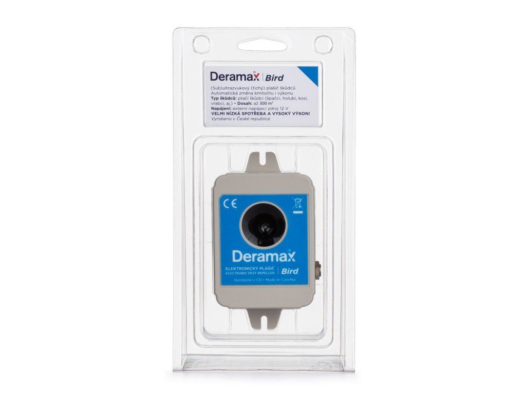 Přístroj Deramax® Bird je určen k využití jako plašič ptáků. Generuje specifické subultrazvukové signály, které jsou pro ptáky velmi nepříjemné, takže po krátkém čase chráněný prostor opouštějí a hledají si nové útočiště mimo chráněnou oblast. V našich podmínkách je přístroj využitelný především proti holubům, špačkům, vrabcům, kosům, havranům, vránám, datlům a strakapoudům. Provoz je ekologický bez využití chemických prostředků.