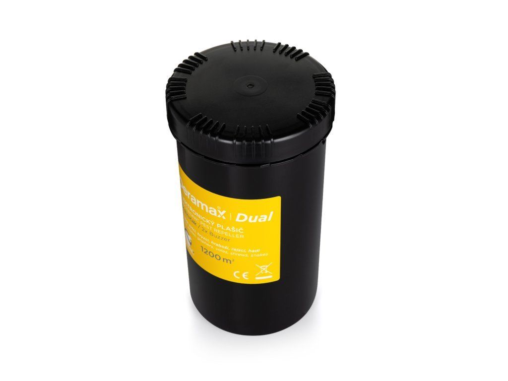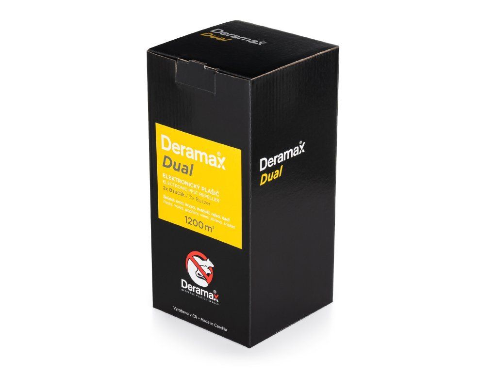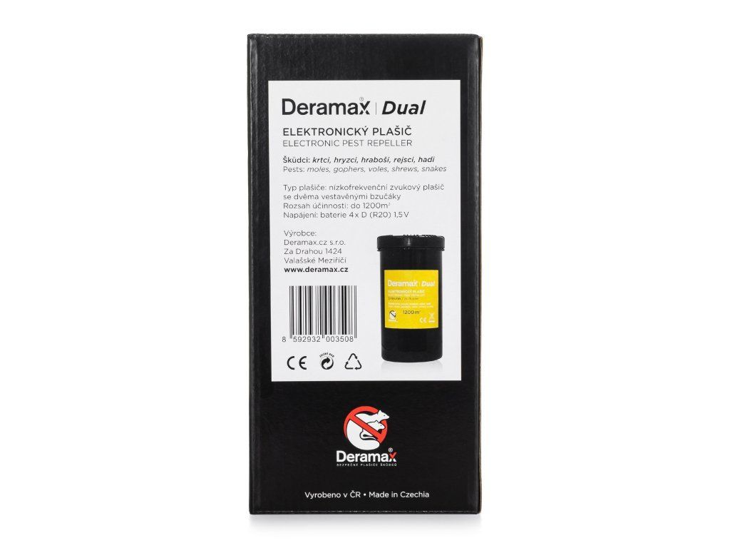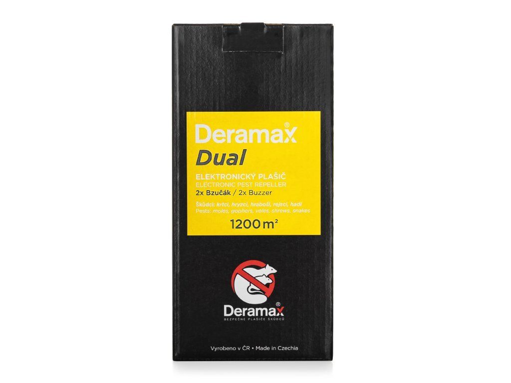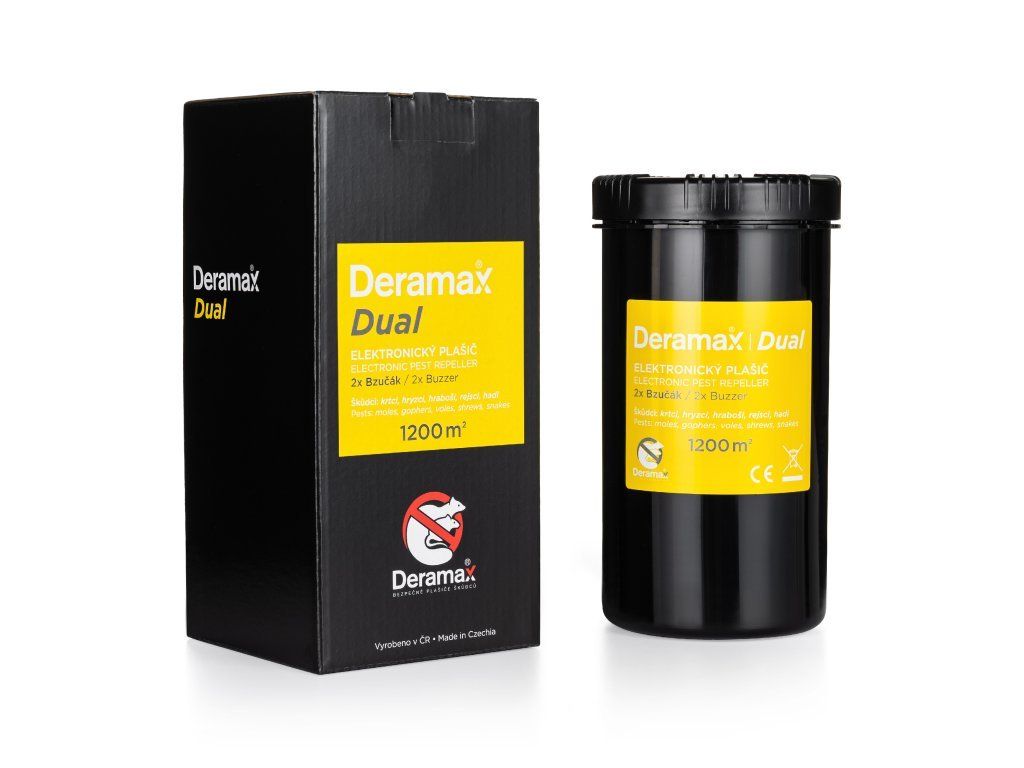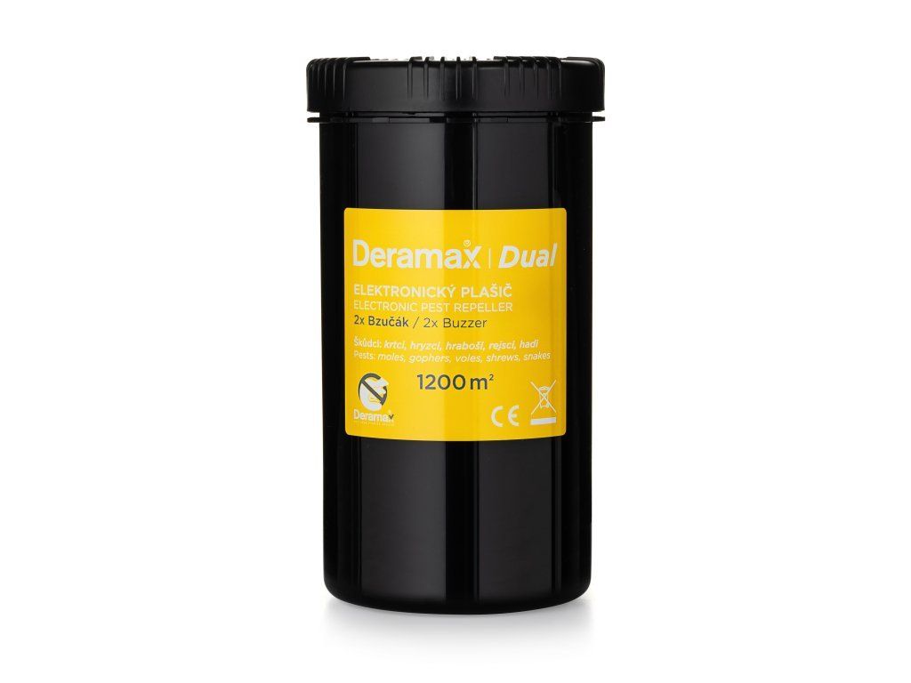 Deramax® Dual je vibrační plašič určený proti „zahradním“ škůdcům žijícím v podzemních norách a proti hadům. Generuje intenzivní horizontální vibrace, které cílené druhy vnímají velmi negativně a opouštějí plochu chráněnou plašičem. Přístroj je určený pro celoroční provoz a díky uložení do půdy je jeho hlučnost zcela nulová.