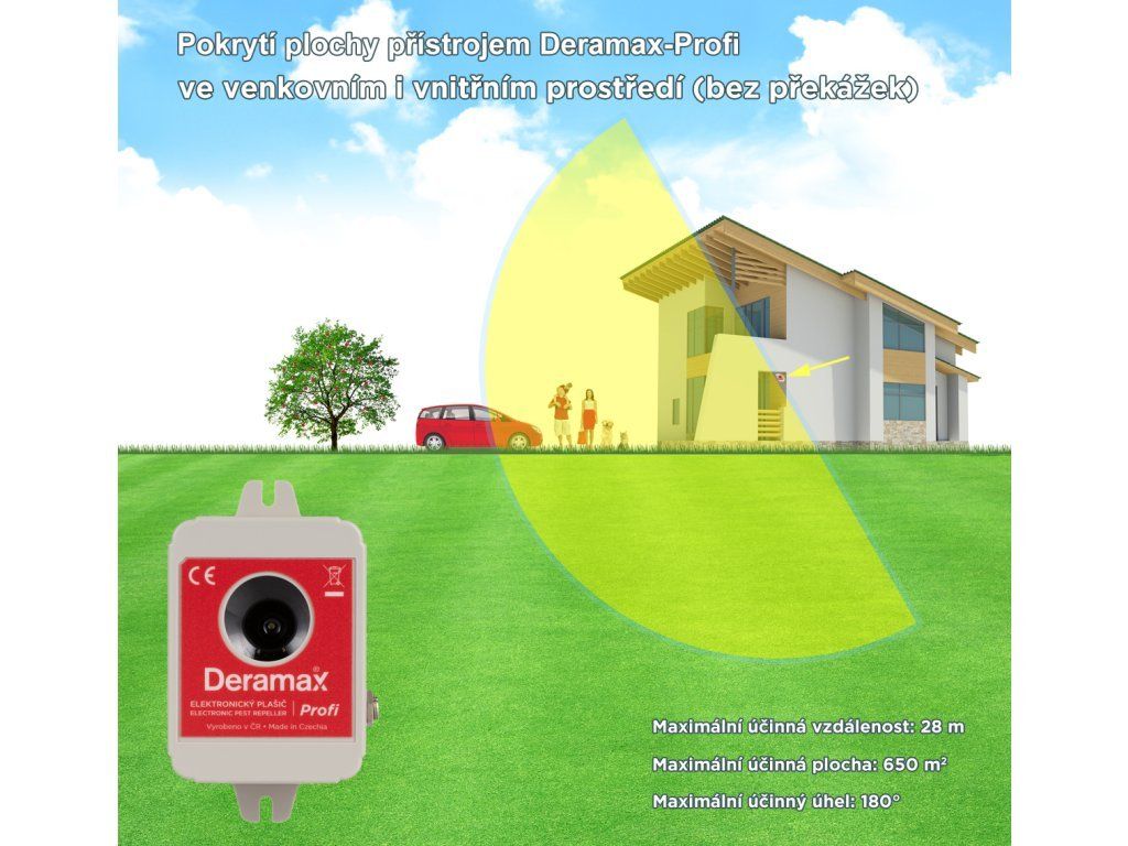 Plašič Deramax® Profi slouží k ochraně vnitřních i venkovních prostor před kunami, hlodavci a rejsky. Přístroj je pro člověka zcela bezpečný a bezhlučný. Škůdci jsou trvale obtěžováni ultrazvukovými signály plašiče a v krátkém čase chráněný prostor opouští. Provoz přístroje je ekologický bez využití chemických prostředků.
