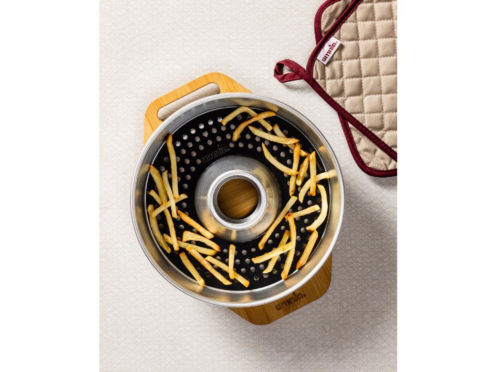Praktická pečicí vložka s děrovaným dnem usnadňuje přípravu jídla v troubě Omnia a zajišťuje perfektní cirkulaci horkého vzduchu. Díky nepřilnavému keramickému povrchu z nerezové oceli se jídlo nepřipéká a vložka se snadno čistí – ideální pro přípravu hranolků, zeleniny nebo dalších menších jídel bez starostí.