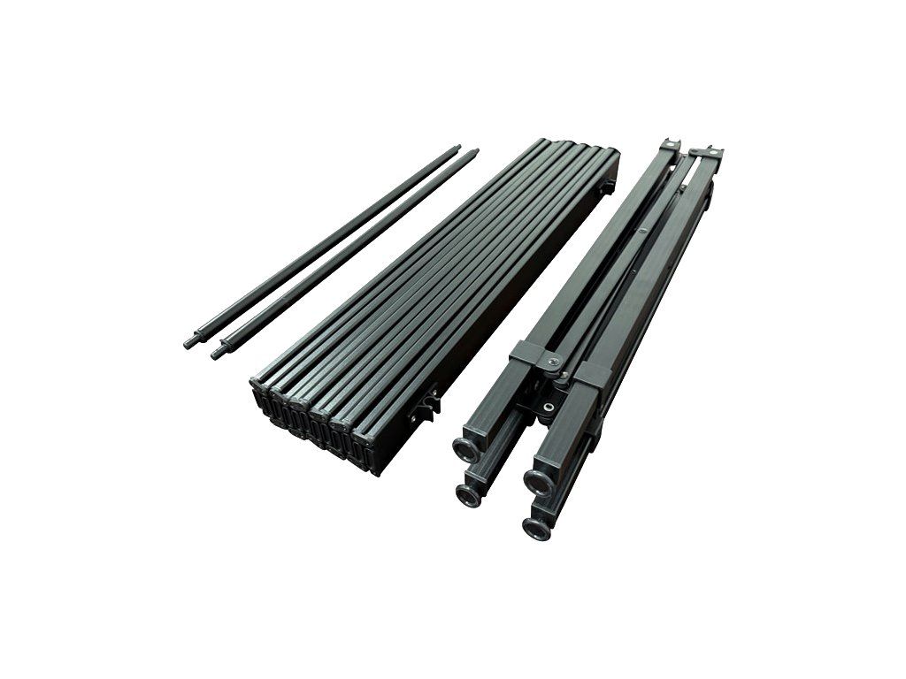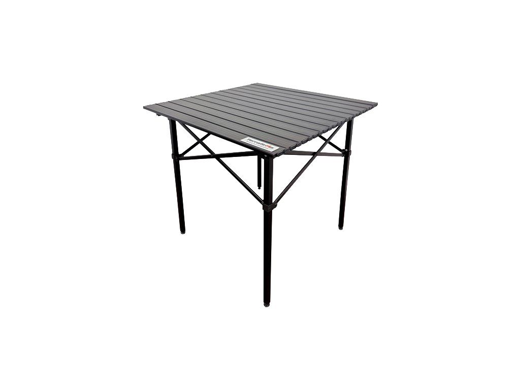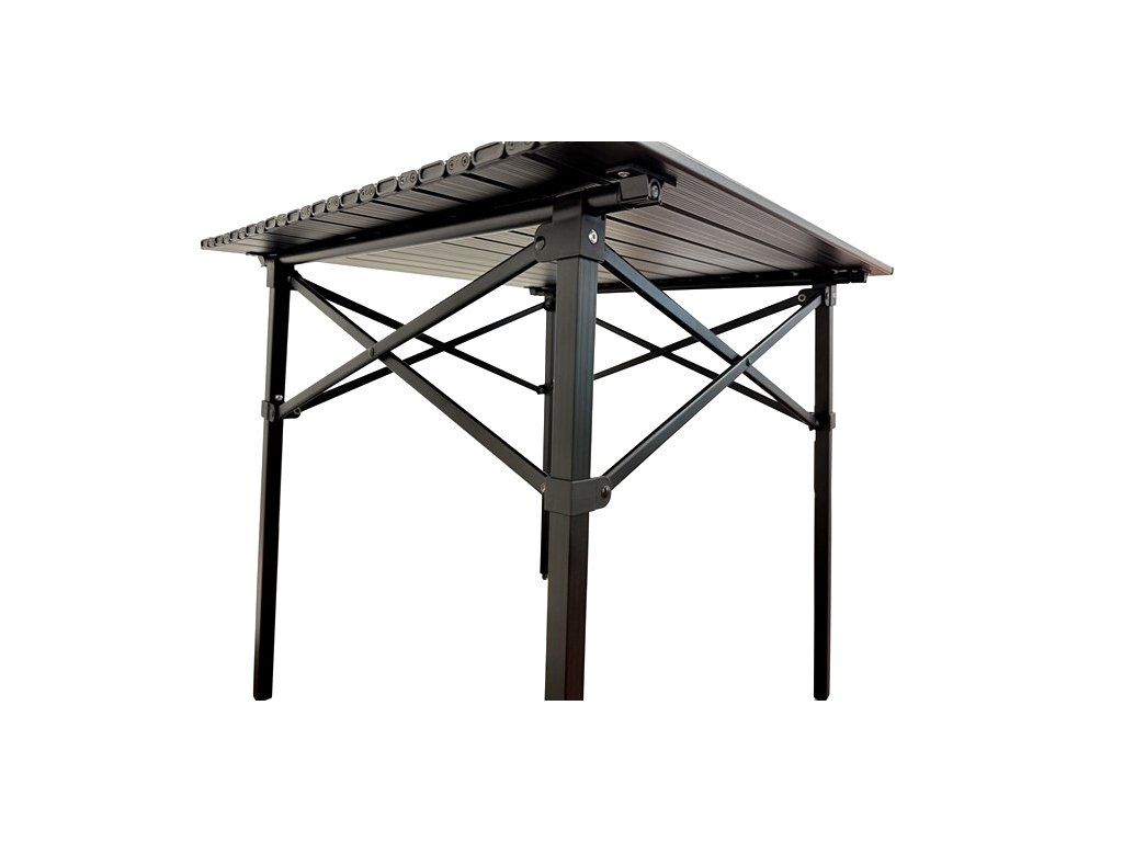 Stůl využívá pevné hliníkové nohy z 22mm box profilu a tuhé hliníkové lamely desky s černou práškovou povrchovou úpravou. Konstrukce je lehká, ale zároveň dostatečně odolná pro pravidelné používání v terénu i na cestách.