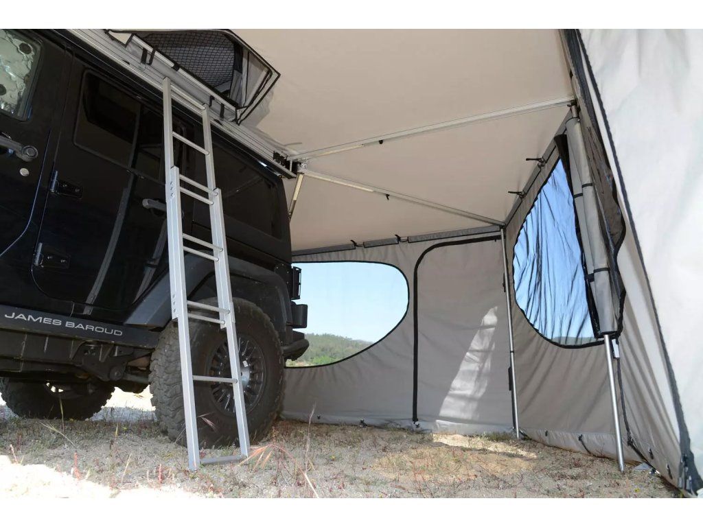 S bočními stěnami se James Baroud Falcon 270° promění v plnohodnotné zázemí na cestách – chráněné před větrem a deštěm a zároveň příjemně světlé. Set tvoří pět nezávislých panelů, které se zavěsí do horní konstrukce markýzy a vzájemně propojí zipy.