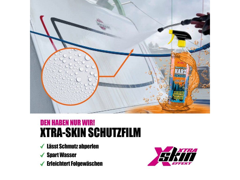 Po vyčištění zanechá přípravek díky Xtra Skin efektu na povrchu téměř neviditelnou ochrannou vrstvu. Ta pomáhá, aby se nové pryskyřičné kapky méně snadno přichytávaly – ideální, když často parkujete v přírodě nebo kempujete pod stromy.