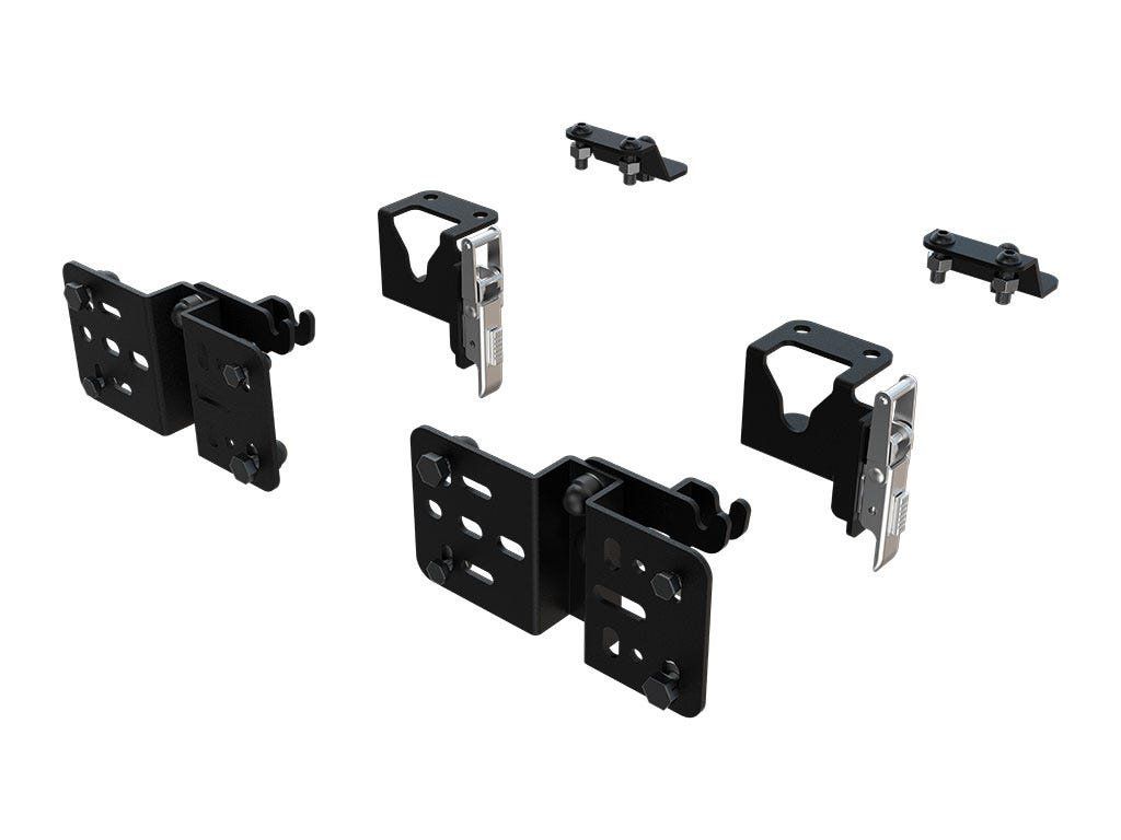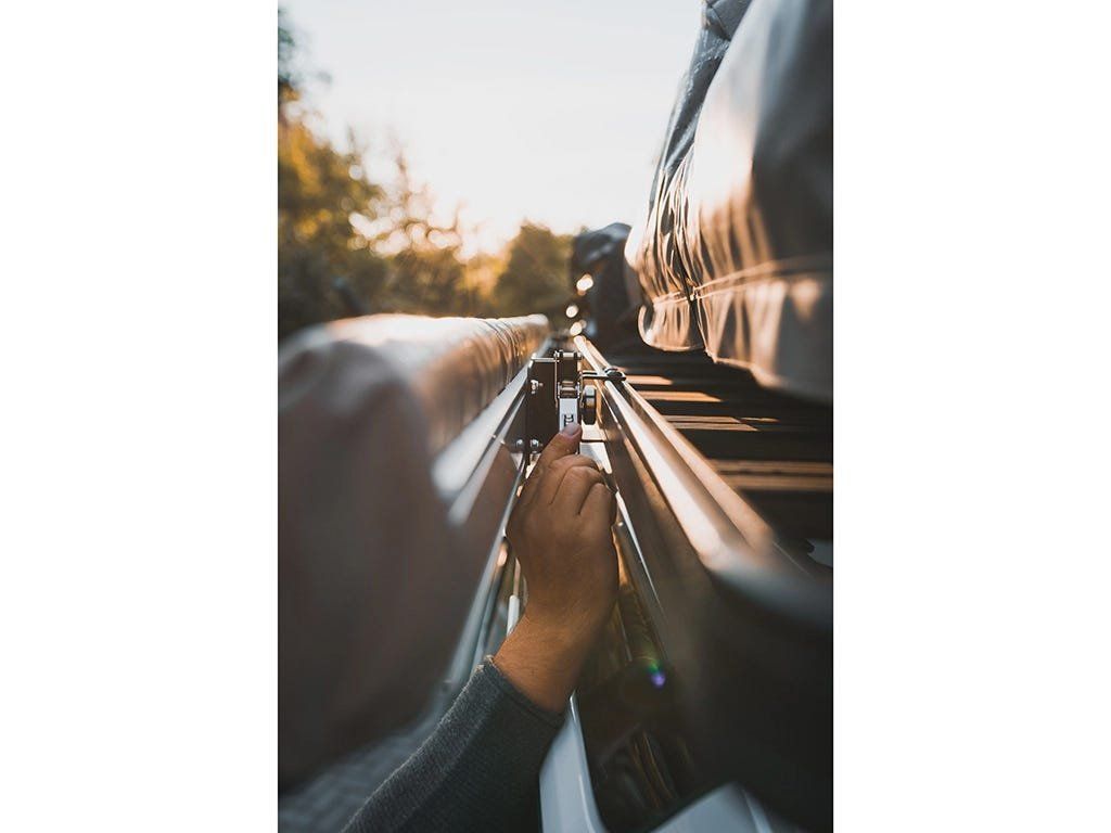 Jakmile jsou tyto držáky nainstalovány na nosiči Front Runner, není k demontáži ani opětovné montáži markýzy potřeba žádné nářadí. Stačí jednoduše uvolnit dvě západky a markýzu během několika vteřin sundat.