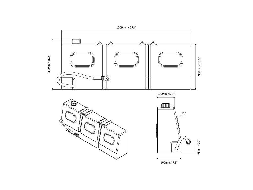 Tato šikmá vodní nádrž o objemu 50 l (13,2 gal) je navržena pro maximální využití prostoru umístěním za zadní sedadla užitkových vozidel.
