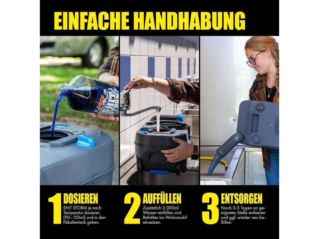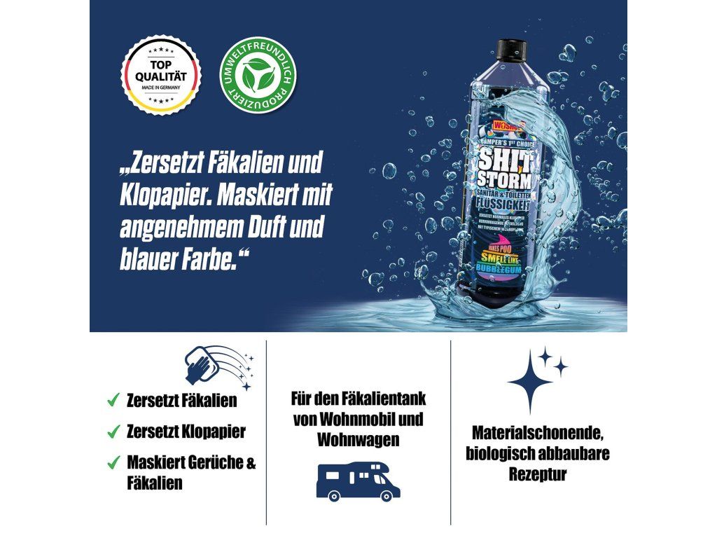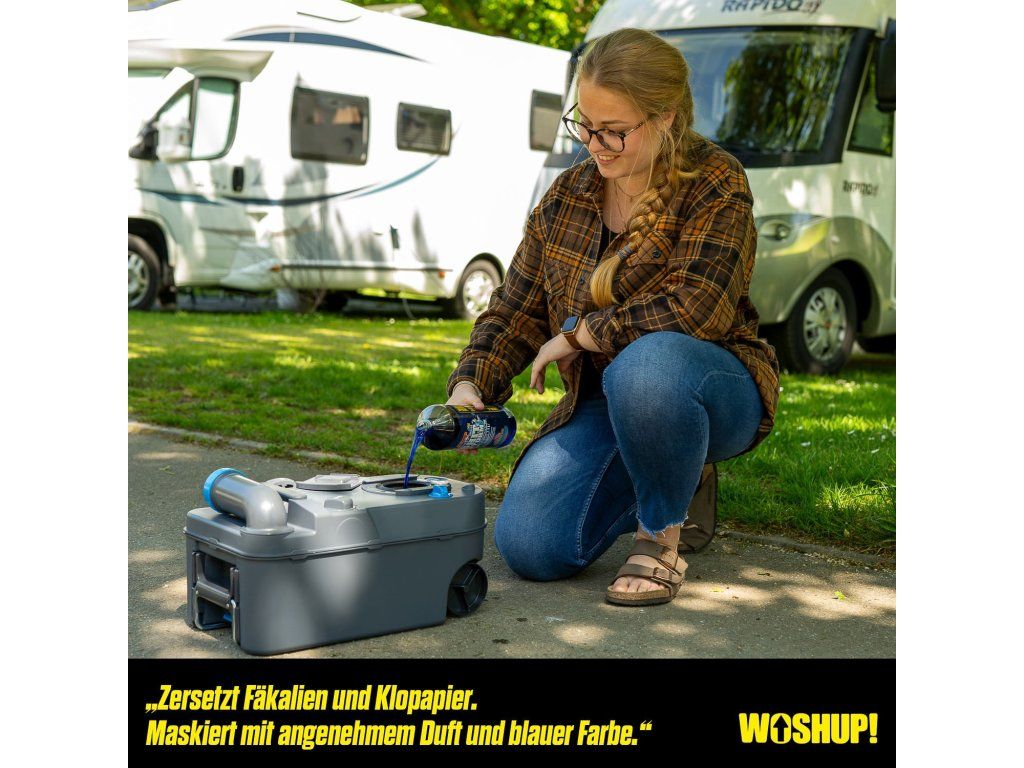Hygiena v mobilní toaletě je při cestování zásadní – a právě tady pomůže Woshup Shitstorm Bubblegum. Tato přísada do chemického WC byla vyvinuta a vyrobena v Bavorsku a je navržena tak, aby dlouhodobě podporovala hygienický a bez zápachu fungující odpadní tank.