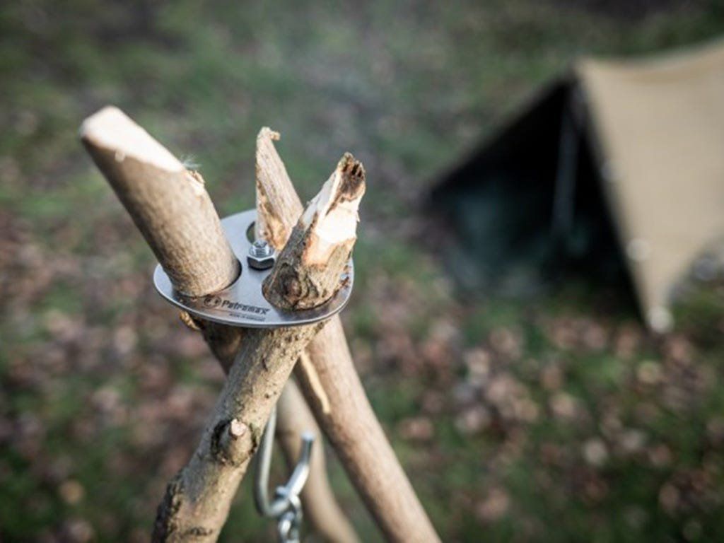 Lehký nerezový kotouč slouží jako základní konstrukce pro výrobu vlastní třínožky z větví. Větve jednoduše protáhnete otvory a lehce je zafixujete pootočením. Díky tomu si rychle postavíte stabilní trojnožku pro vaření na ohni bez potřeby klasického stojanu.