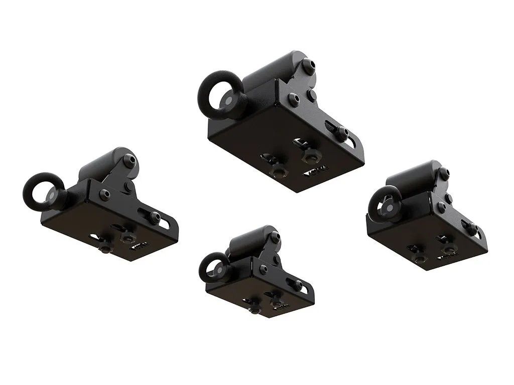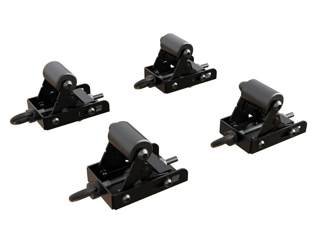 Při použití sady Quick Release Tent Mount Kit / 4 Piece mohou válečky pojmout základny stanů, které jsou buď zarovnané s nosnou plochou, nebo až o 27 mm vyšší díky integrovanému nastavení výšky.