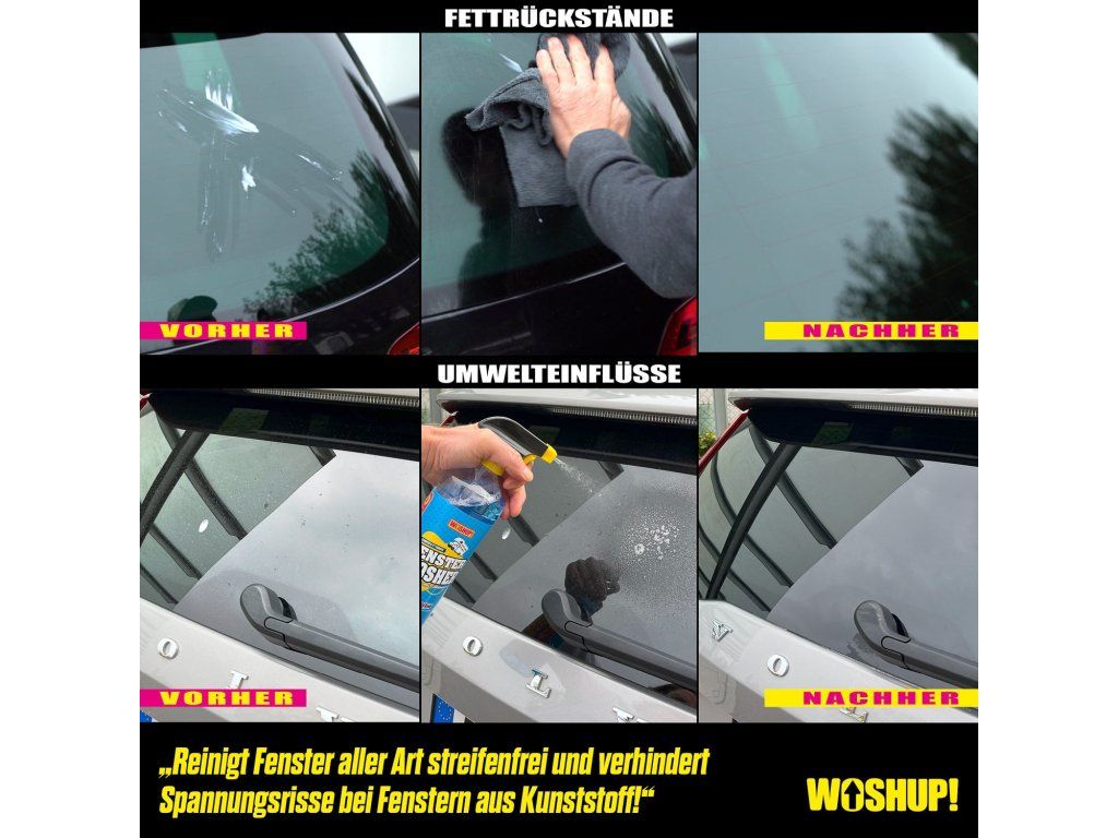 Plastová okna a průhledy (polykarbonát, akrylát) potřebují při čištění správnou chemii – běžné čističe mohou časem způsobovat tzv. stresové praskliny. Woshup Fenster Wosher je čistič oken, který má vědecky certifikovanou kompatibilitu s polykarbonátem a je navržený tak, aby okna čistil účinně, ale zároveň bez rizika praskání u akrylátových a plastových oken.