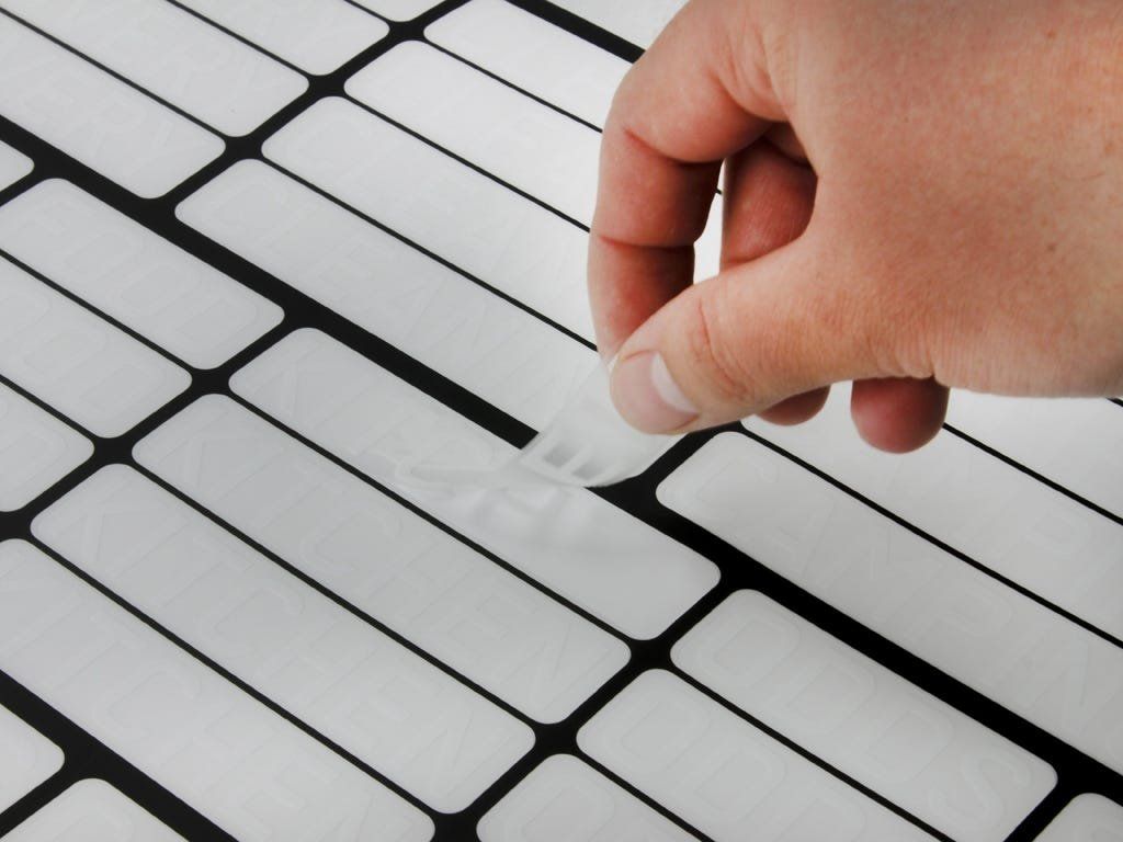 • Bílý text na průhledné vinylové fólii – nenápadné, ale dobře čitelné označení